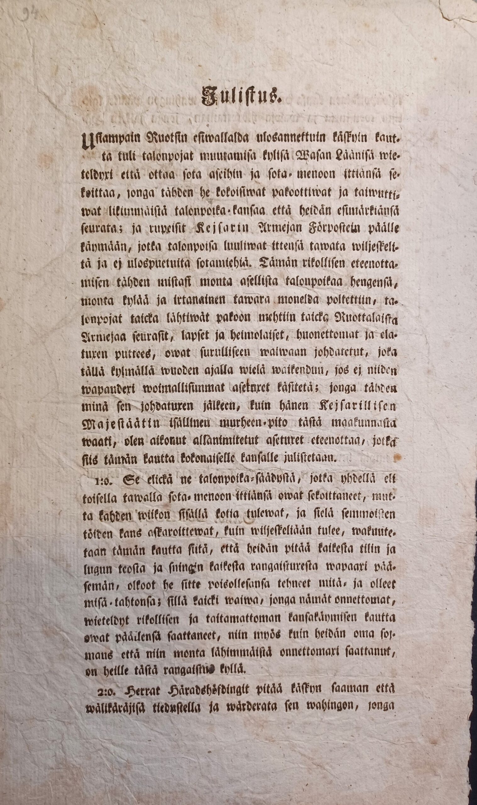 Källan är skriven på gammal finska. Den är en ”Deklaration” som har getts av tsaren, det vill säga Rysslands härskare. I deklarationen sägs det att bönderna i byn Muurame i Vasa, under uppmaning från den svenska förvaltningen, har gjort uppror mot det ryska styret. Här kan man dra slutsatsen att källan är från finska kriget (1808–1809) eller strax därefter, när Ryssland och Sverige kämpade om kontrollen över Finlands område.